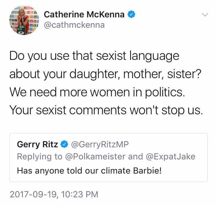 As an immigrant to Canada with a deep interest in environmental protection, I first came to know of Catherine McKenna through the mistreatment she faced in public life, rather than through her many contributions to Canadian and global politics. Ms. McKenna is a former lawyer, diplomat, and Canada’s former Minister of Environment and Climate Change. She is also known for describing herself as a lifelong “stubborn climate optimist.” This blog post focuses on the gender-based violence and harassment she experienced during her time in public office. If this topic may be triggering for you, please take care while reading.
